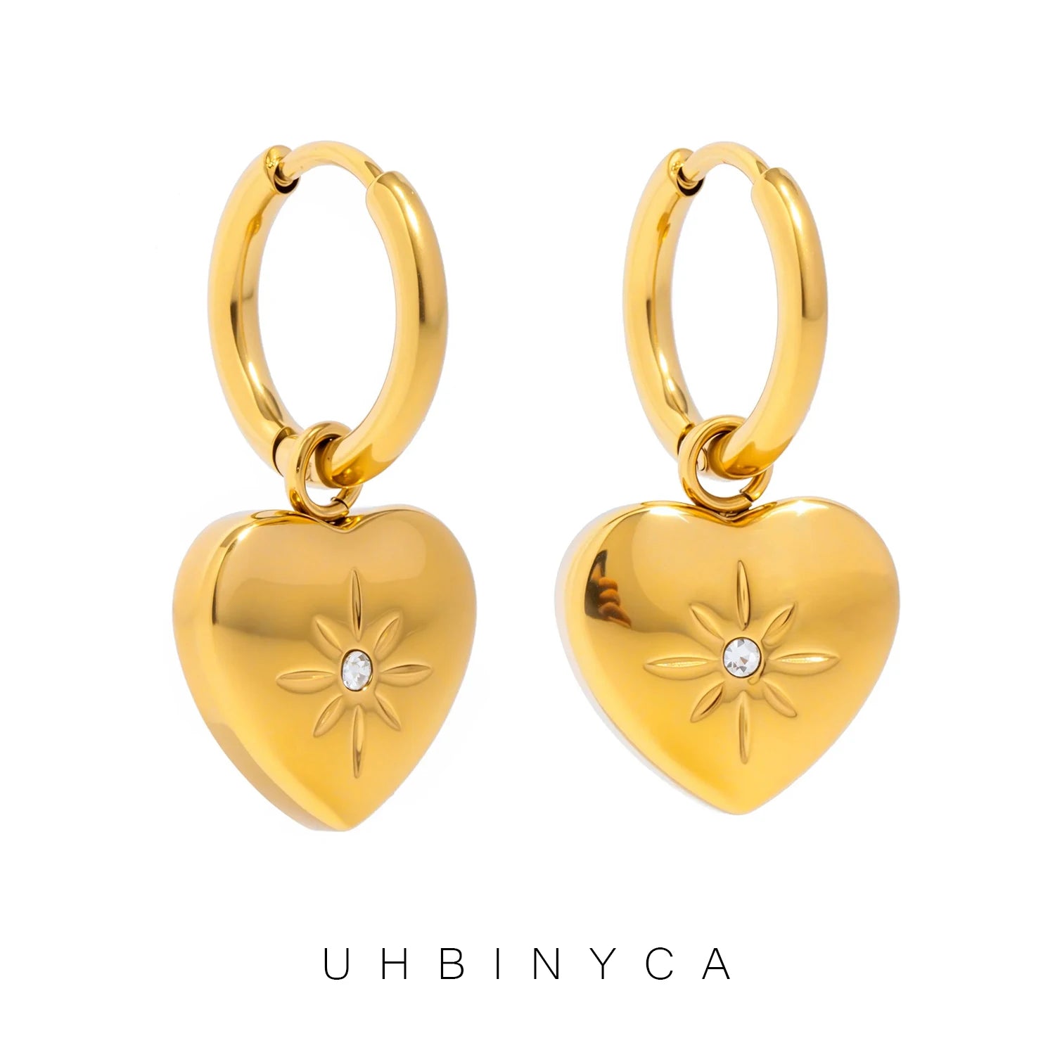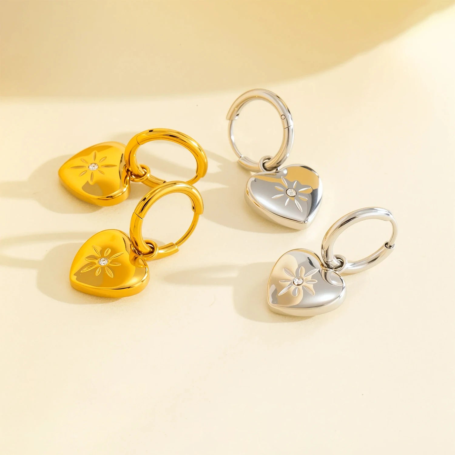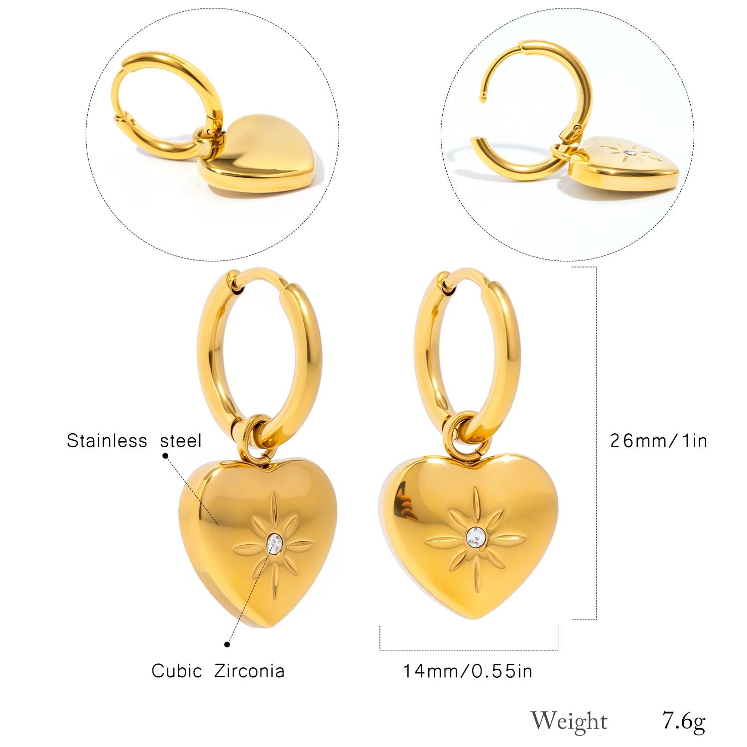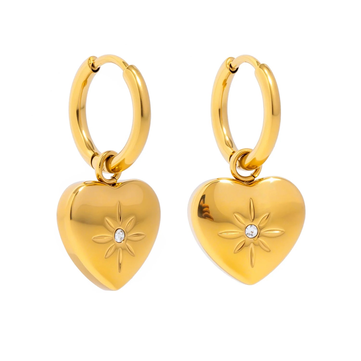 Brincos pendentes em formato de coração com banho de ouro 18K, confeccionados em aço inoxidável de primeira qualidade. O design clássico e romântico combina sofisticação com versatilidade, adequado para ocasiões especiais e uso diário. Fabricados com precisão técnica, apresentam acabamento duradouro e resistente ao desgaste. Livres de componentes químicos prejudiciais, garantem segurança e conforto prolongado. Uma escolha refinada para quem aprecia joias que unem elegância atemporal com qualidade estrutural comprovada.
