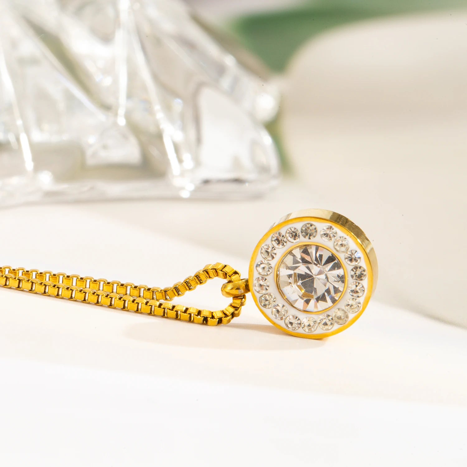 Elegante colar feminino com pendente brilhante em aço inoxidável, revestido em ouro 18k por processo PVD de alta durabilidade. Corrente tipo caixa polida com acabamento espelhado que reflete luz de forma deslumbrante. Perfeito para realçar seu estilo em festas, eventos especiais ou no dia a dia, este acessório versátil combina sofisticação com praticidade. Compatível com diversos estilos e ocasiões, oferece o brilho do ouro genuíno sem comprometer a resistência. Uma escolha refinada para quem busca qualidade e elegância em um único acessório.