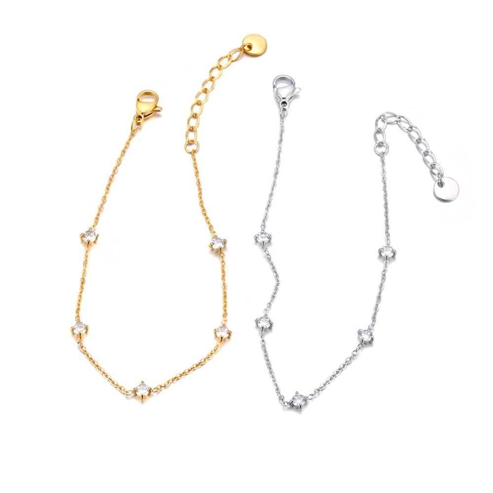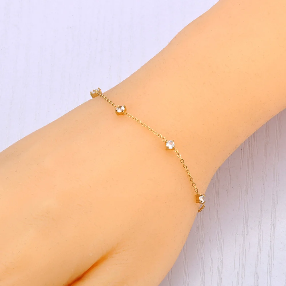 Pulseira feminina em aço inoxidável com banho de ouro 18K, adornada com zircônia cúbica que captura luz com brilho incomparável. A corrente tipo cobra oferece fluidez e elegância, enquanto o fecho de lagosta garante segurança e facilidade de uso. Criada pela Lokaer, esta pulseira delicada é perfeita para casamentos, celebrações ou para elevar seu look cotidiano com sofisticação. Seu design minimalista e refinado a torna versátil, combinando com qualquer ocasião e complementando tanto estilos clássicos quanto contemporâneos. Uma escolha impecável para quem busca joias que unem durabilidade e beleza atemporal.